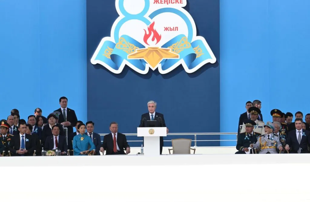 Далее Верховный главнокомандующий Касым-Жомарт Токаев начал свою торжественную речь с трибуны. Он поздравил казахстанцеы с 80-летием Великой Победы и заявил о модернизации армии и поддержке военнослужащих и спецслужб.