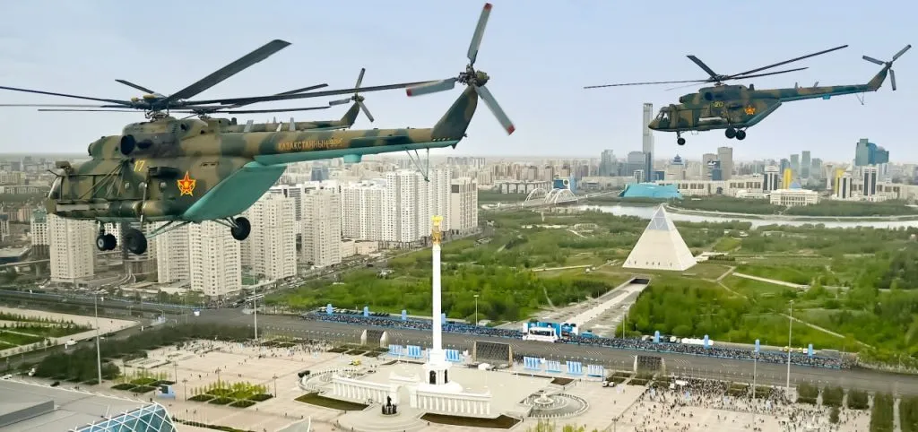 Авиационную часть парада открыл строй вертолётов Ми-171, пронёсших над площадью Государственный флаг Казахстана и знамя Вооружённых сил.