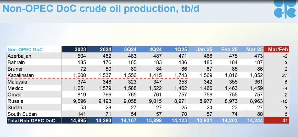 По словам Чукина, страна серьёзно превысила согласованную с картелем квоту по добыче. В апреле Казахстан вышел на рекордные 2 млн баррелей в сутки — при том что официальная квота по соглашению ОПЕК+ составляет 1,468 млн. Это почти 2% от мировой добычи и около 5% внутри самого картеля. На этом фоне раздражение Саудовской Аравии выглядит понятным: превышение Казахстана уже «съедает» четверть той жертвы, на которую пошли саудиты, добровольно сократив добычу на 2 млн баррелей.