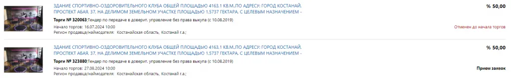 Отметим, что это не первый раз, когда акимат региона ищет управляющего для актива. Сначала его выставили в конце июня. Условия для желающих отличались. Вместо 10 лет доверительного управления значилось семь. Кроме того, управляющий должен был ежедневно отдавать спортивные залы на не менее трёх часов воспитанникам детско-юношеских спортивных школ на безвозмездной основе. Отличалась и стоимость гарантированного взноса – 44 152 804 тенге. Но торги отменили ещё до их начала. В новой условиях торгов уже нет условий про три бесплатных часа для воспитанников спортшкол.