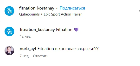 По данным 2GIS, филиал в Костанае на настоящий момент не работает. В социальных сетях последний пост датируется 20 мая 2024 года. При этом в комментариях пользователи задают вопросы, работает ли это отделение Fitnation.
