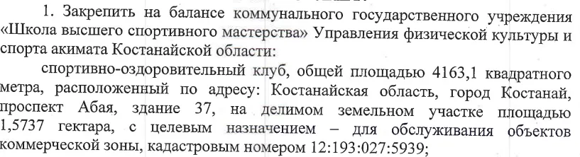 Первыми о лоте написали в Nege.Aqsha. Как выяснилось, бывший фитнес-клуб Боранбаева сейчас находится на балансе "Школы высшего спортивного мастерства" Костанайской области. Нового управляющего для актива решило найти управление финансов региона.