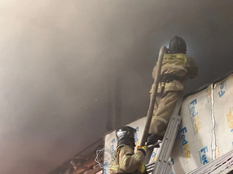 "Объект пожара склад ангарного типа. Пожарные производят вскрытие кровли здания. На месте создан штаб пожаротушения. Работают три боевых участка. Тушение осложняется высокой пожарной нагрузкой и сильным задымлением. Организована бесперебойная подача воды и оцепление".
