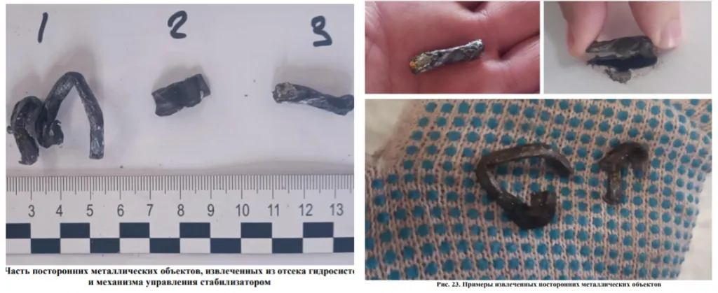"Первоначальный осмотр сохранившихся фрагментов выявил множество сквозных и несквозных повреждений разной величины и формы в хвостовой части фюзеляжа, киля и стабилизатора, рулей высоты и направления. Схожие повреждения были обнаружены на левом двигателе и левом крыле воздушного судна, а также на агрегатах и компонентах воздушного судна. В некоторых местах повреждения имеют правильную прямоугольную форму», — говорилось в отчёте.