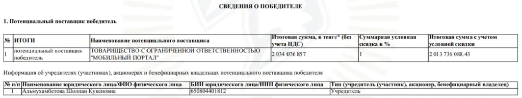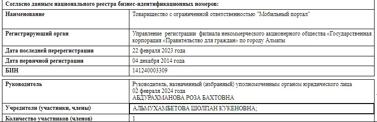 Что же касается громких имён и фамилий, то их действительно нет. Точнее, их не найдёшь, если проверять только саму компанию. ТОО «Мобильный портал» принадлежит Шолпан Альмухамбетовой. Отметим, что с момента заключения контракта в организации изменился директор. 7 февраля 2024 года кресло руководителя заняла Роза Абдурахманова.