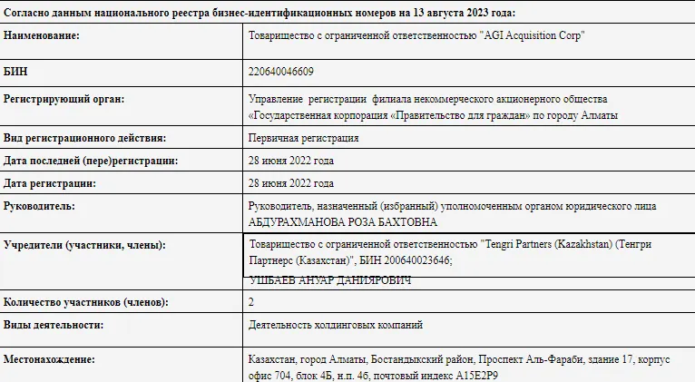 До 14 августа 2023 года Роза Абдурахманова руководила другой компанией – ТОО «AGI Acquisition Corp». Учредителями предприятия выступают ТОО «Tengri Partners (Kazakhstan) (Тенгри Партнерс (Казахстан)» и управляющий партнер Tengri Partners Ануар Ушбаев. Занимается относительно молодая организация деятельностью холдинговых компаний.