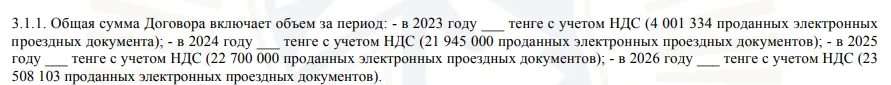 Если исходить из комиссии в 29 тенге и стоимости услуг по продаже за 2024 год, то количество онлайн-билетов будет ниже, чем указано в проекте электронного договора. Вместо 21 945 000 штук ТОО «Мобильный портал» сможет реализовать 21,3 млн онлайн-билетов.