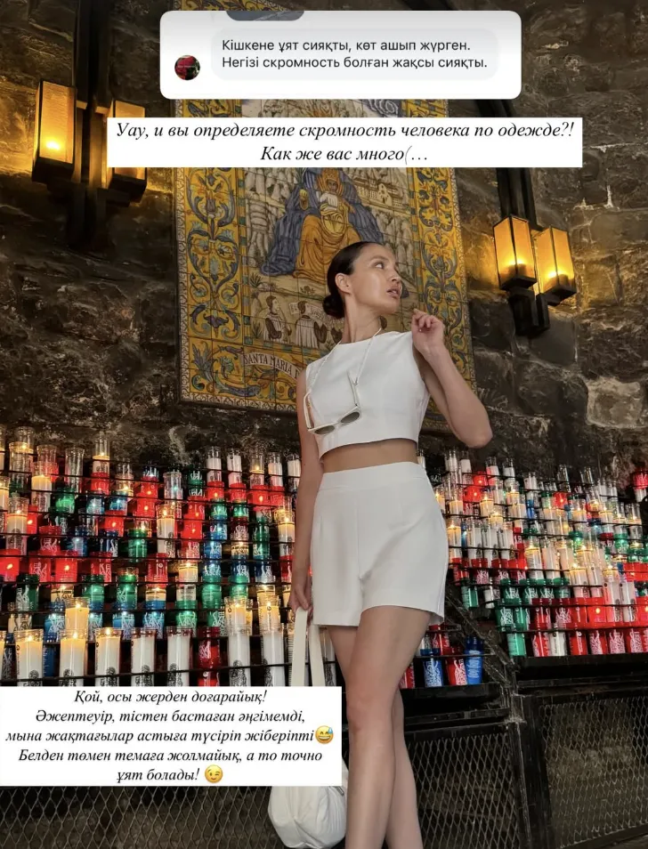 Многие пользователи осудили внешний вид звезды, посчитав, что ей не следует носить столь откровенные наряды. «Ты же мать четверых детей», — писали комментаторы, напоминая о семейном статусе актрисы. Некоторые добавили: «Где Кайрат и почему он это допускает?» — имея в виду её супруга, популярного певца Кайрата Нуртаса.