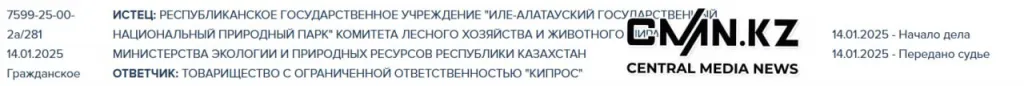 В суде апелляционной инстанции есть ещё один суд по делу «Иле-Алатауский государственный национальный природный парк» против ТОО «Кипрос», но дело закрыто для публикации.