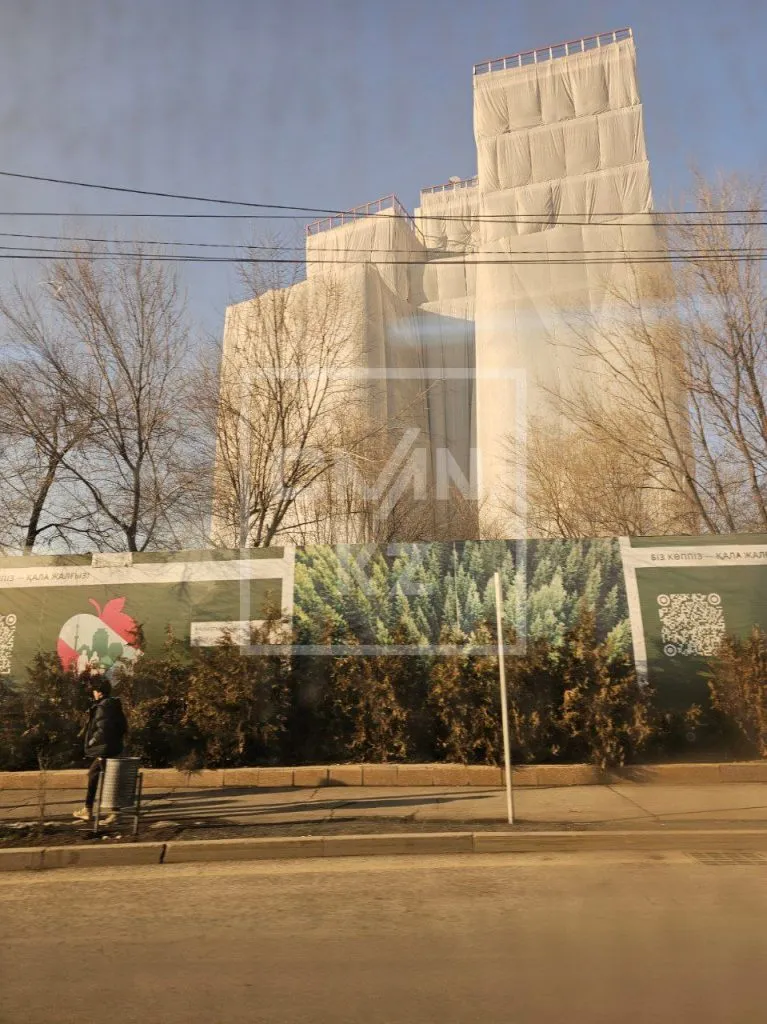 Фото 2: Бизнес-центр накрыли защитным полотном, февраль 2025 года.
