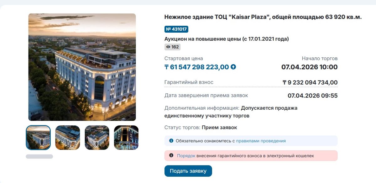 Теперь в «КУВА» выставили на торги здание «Kaisar Plaza». Они состоятся 7 апреля в 10:00. Стартовая цена лота – 61,5 млрд тенге.