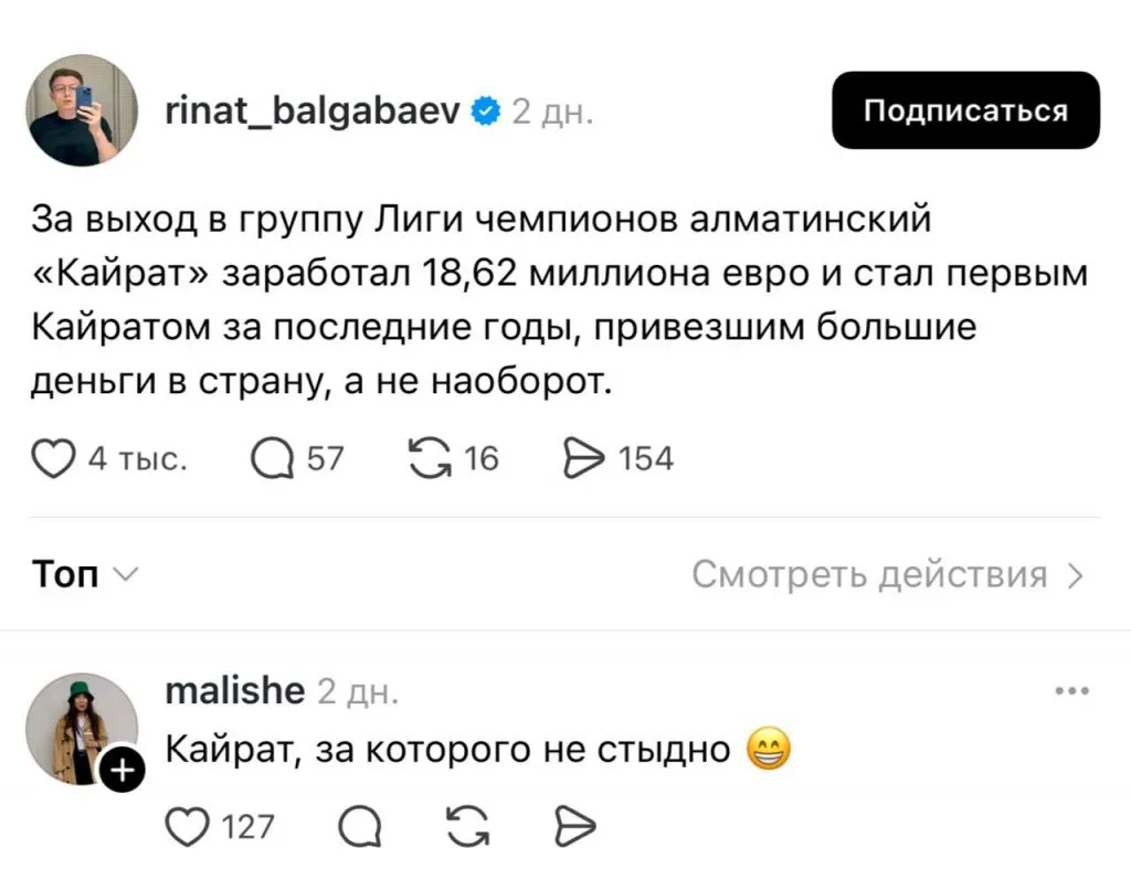 Тем не менее, народ очень хвалит алматинских футболистов и даже отмечает, что это единственный Кайрат во всём Казахстане, который принёс прибыль стране, а не наоборот.