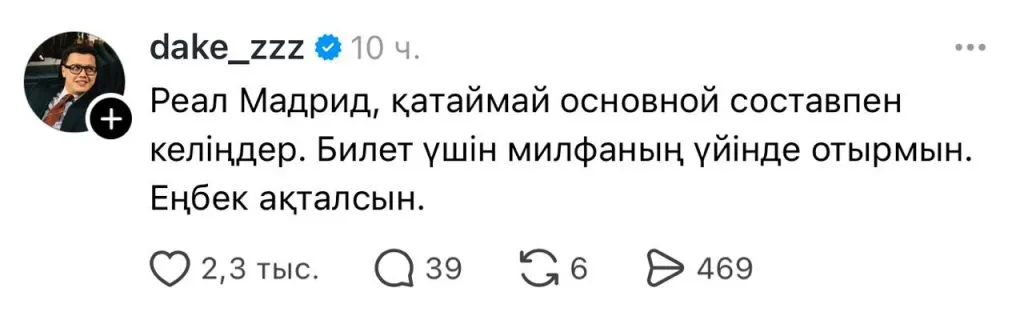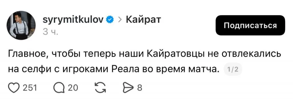 "Главное, что теперь наши Кайратовцы не отвлекались на селфи с игроками Реала во время матча", — написал Сырым Иткулов.