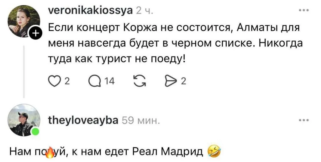 Одна девушка написала в социальных сетях, что больше никогда не приедет в Алматы, если концерт Коржа не состоится. Но, алматинцам стало уже все равно, они ждут Реал.