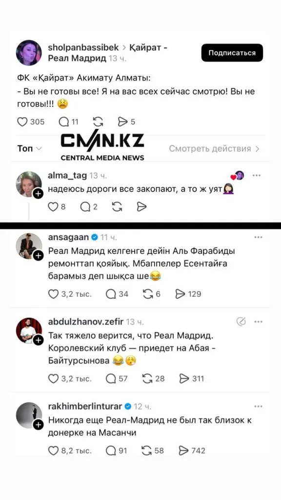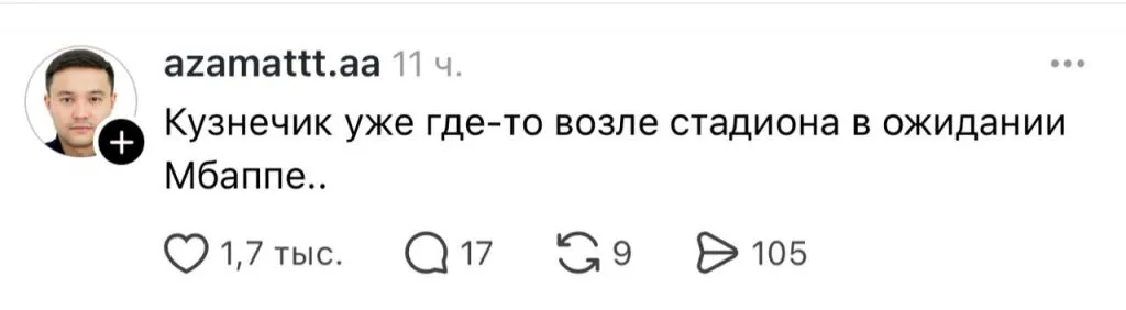 Больше всего лайков и репостов набрали шутки про готовность Алматы к приезду футболистов Мадрида. Один из комментаторов обратился к акимату и попросил завершить ремонт по проспекту Аль-Фараби до приезда соперников.