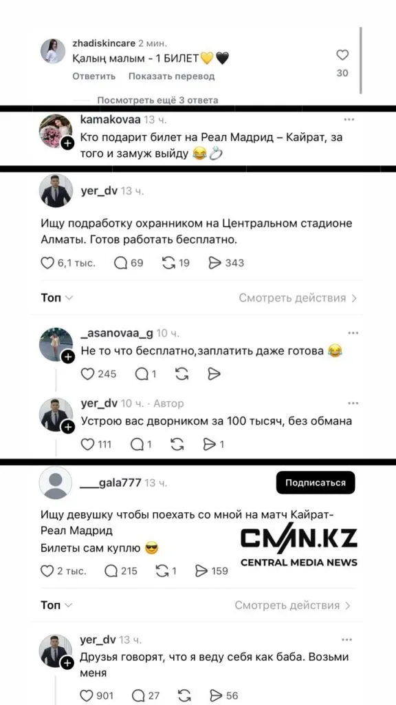 Буквально сразу же после оглашения результатов жеребьёвки мужчины начали публиковать посты о том, что ищут спутницу на матч "Кайрата" и "Реала".