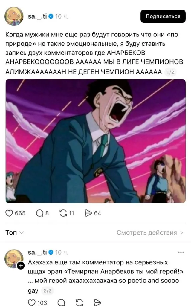 Девушки также вспомнили комментаторов, которые после окончания серии пенальти на матче «Кайрата» с «Селтиком» кричали в прямом эфире имя Темирлана Анарбекова — героя всей страны.