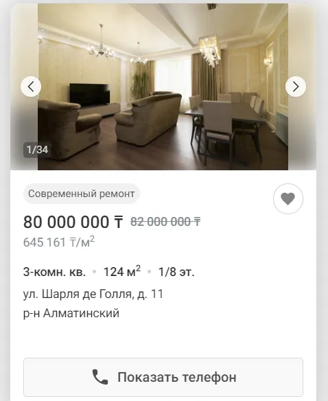 Интересно также, что схожее по условиям и метражу жилье продаваемое на этой улице в среднем стоит в два разе дешевле чем минимальная цена продажи аукциона. К примеру, квартира с квадратурой 159,1 м. кв. стоимостью 85 800 000 тенге и другая чуть поменьше - 121 кв. м – 80 000 000 тенге. При этом обе из них меблированы хотя бы частично и с ремонтом.