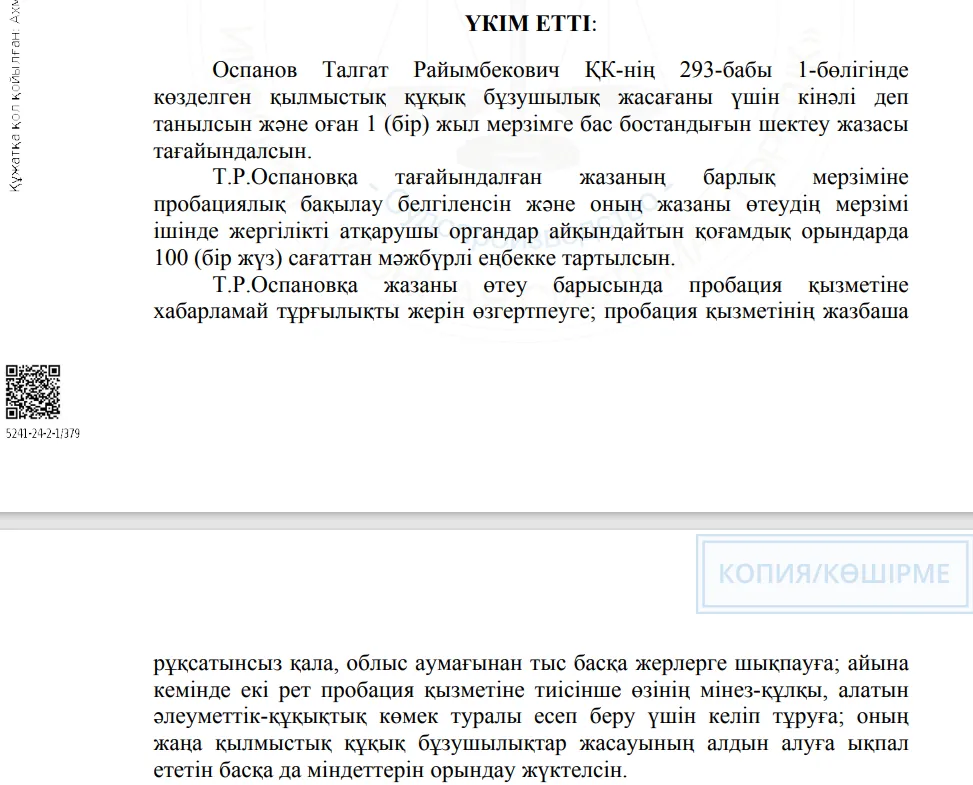 Впрочем, 28 марта судья Шымкентского межрайонного суда по уголовным делам Нургиса Ахмет посчитал, что одного года ограничения свободы достаточно. В довесок Оспанову присудили 100 часов исправительных работ и принудительное лечение в наркологии.