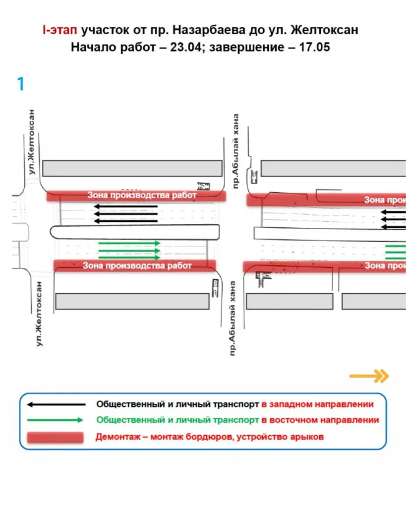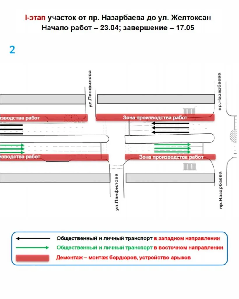 "Работы пройдут в два этапа. До июня — монтаж арыков, остановок и переноса коммуникаций с частичным ограничением движения. С июня — укладка асфальта, разметка, обновление тротуаров, велодорожек и озеленение", – уточнили в госадминистрации.