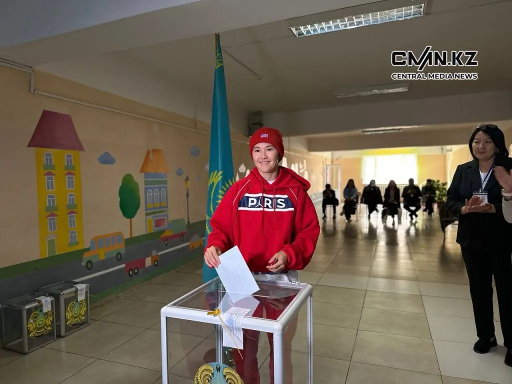 Казахстанская боксёрша проголосовала на избирательным участке №515 в 8:10 утра. Кызайбай встретили под аплодисменты и национальную музыку.