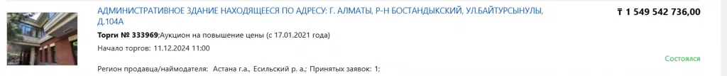 11 декабря в 11:00 здание снова выставили на торги. На этот раз стартовая цена начиналась с 1,5 млрд тенге. Именно за эту стоимость актив в итоге и реализовали.