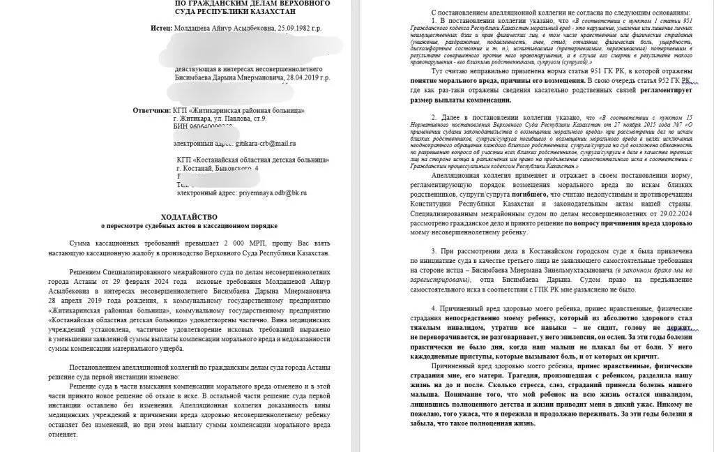 «В 2024 году, уже в Астане, мы подали повторное исковое заявление на областную детскую больницу Костаная. А потом ещё раз привлекли в качестве ответчиков Житикаринскую».