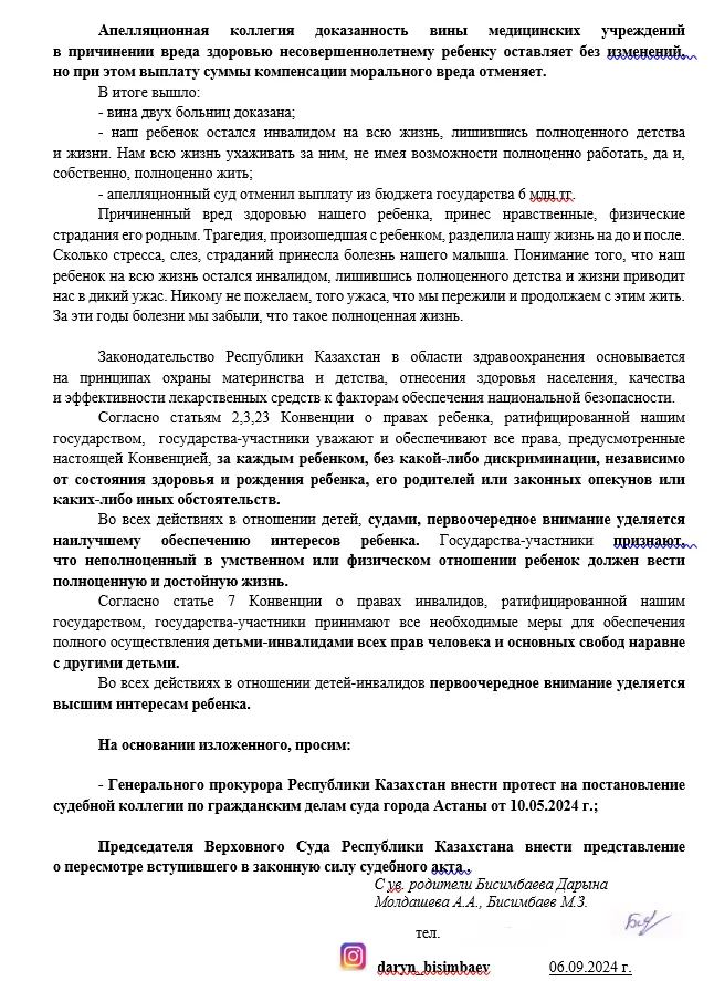 «Дарын стал тяжёлым инвалидом. Сейчас ему уже 5 лет. Вина двух больниц доказана, но выплату в 6 миллионов отменили. Неужели наш госбюджет обеднеет, если выплатит эти деньги ребёнку? На его судьбе и здоровье уже и так поставлен крест. Он недееспособный. На сегодняшний день мы направили кассацию в Верховный суд, но пока движений по ней никаких нет».