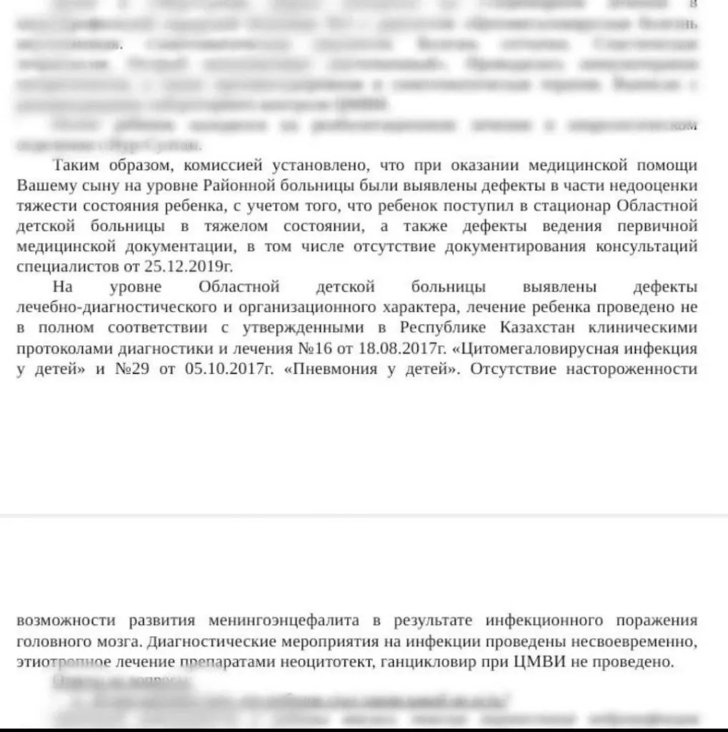 «Я нашёл номер главного детского инфекциониста, позвонил ей, объяснил ситуацию. Попросил повлиять на Костанай, так как начал понимать, что врачи бездействуют. Также я был на приёме у замакима и у акима области. Просил, чтобы нас перевели в Астану. В феврале мне позвонил врач и сказал, что договорился с инфекционной больницей Астаны, мол, "вас там примут на лечение и прокапают необходимые препараты". Потом был телемост, и республиканский специалист порекомендовала нам два препарата против цитомегаловируса».
