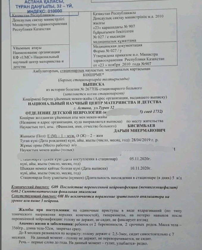 В реанимации присутствовали врачи и заведующие отделением. Родителям сообщили, что маленький Дарын перенёс инсульт и вторичный менингоэнцефалит. А также, что у него погибла часть головного мозга.