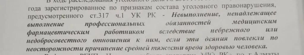 Дело всё-таки открыли в июне 2023 года. Уголовное правонарушение квалифицировали по ч.1 ст. 317 УК РК "Невыполнение (ненадлежащее исполнение) профобязанностей медработниками, повлекшее вред здоровью человека (средняя тяжесть)". Но на сегодняшний день оно не завершено. Также Миерман не понимает, почему уголовное дело квалифицировали по первой части статьи. Разве можно посчитать полную инвалидность "средней тяжестью вреда"?
