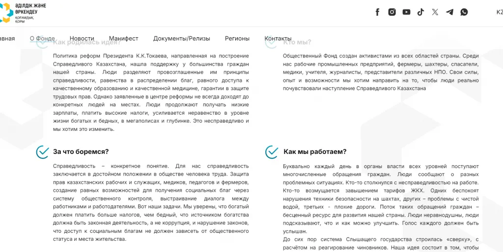 Во-первых, директором фонда значится журналист Дана Рысмухамедова, а в учредителях: экс-генеральный директор "31 канала", телеканала "Алматы", РТРК "Казахстан" Нуржан Мухамеджанова и экс-журналист агентства «Хабар» и бывшая пресс-секретарь фонда "Әділдік және Өркендеу" Гульжан Маркабаева. Цели же организации звучат так: «Объединить людей с активной гражданской позицией, готовых вносить свой вклад в построение справедливого Казахстана – курса реформ, начатых президентом Касым-Жомартом Токаевым».