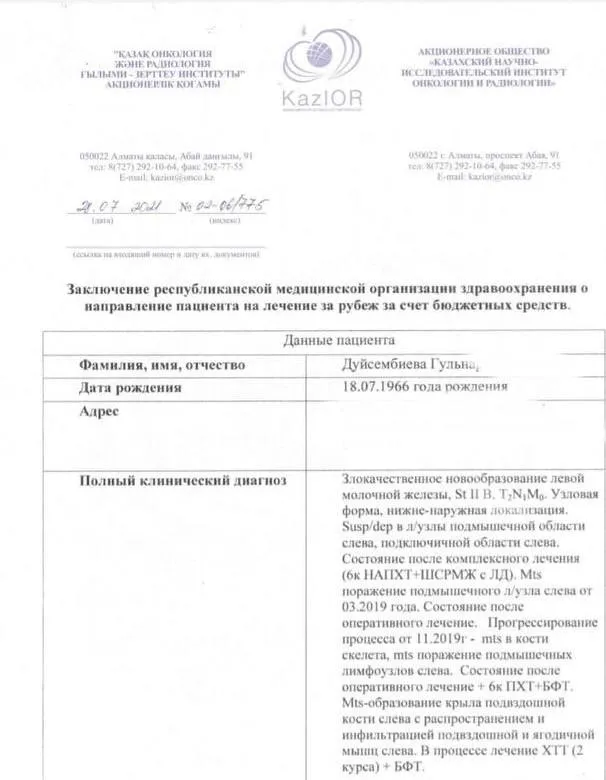 В редакцию CMN.KZ обратилась жительница Алматы Гаухар Дуйсембиева, чья сестра Гульнар Дуйсембиева уже третий год не может получить квоту на лечение рака молочной железы за границей. Министерство здравоохранения объяснило причины отказа в квоте, а также почему пациентка не получает лечение последние полгода