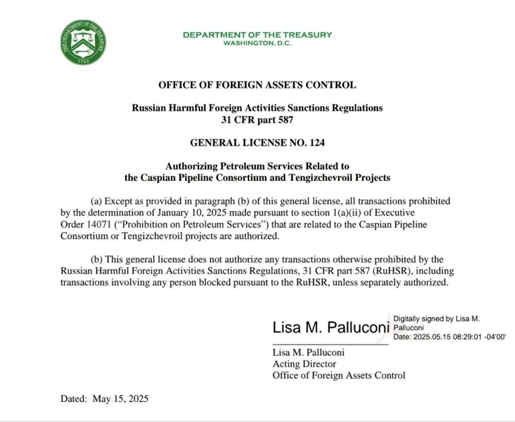 Лицензию от Минфина США получили КТК и «Тенгизшевройл» на проекты, которые ранее были запрещены санкциями против России. Лицензия, похоже, будет действовать на постоянной основе. Срок действия предыдущей лицензии № 121 истекает 28 июня 2025 года. Сроки новой не определены.