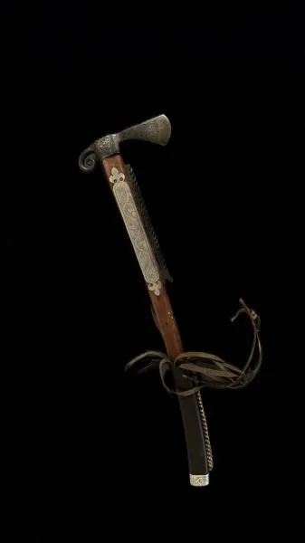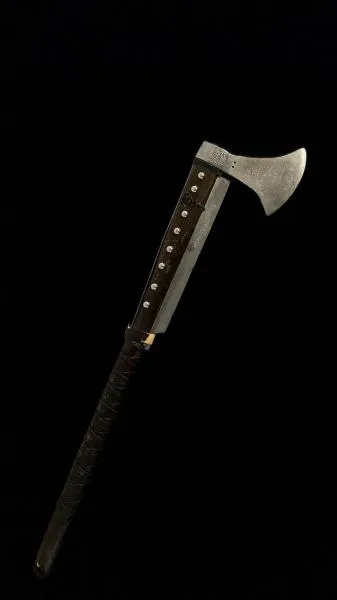 Топор с деревянной рукоятью также имеет дополнительную режущую часть, но напоминающую лезвие ножа. Сама рукоять в центральной части оплетена шнуром.