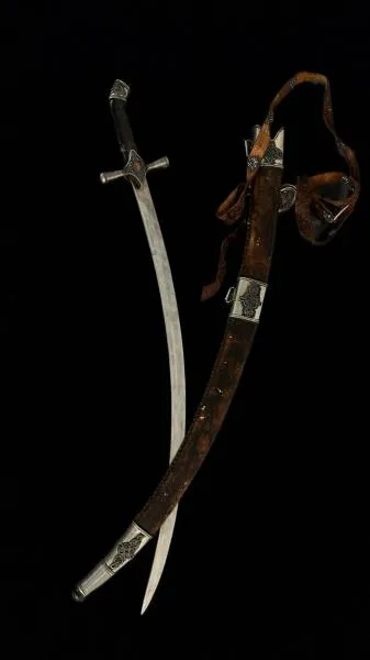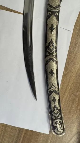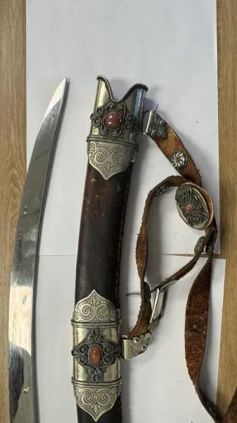 "По всей длине клинка серебряной сабли в ножнах нанесён рисунок в виде растительного орнамента с элементами черни. Рукоять выполнена в виде креста, радиальные части крестовины украшены круглыми деталями. Клинок сабли в кожаных ножнах выполнен из стали, а рукоять – из рога горного козла. Её головка оправлена мельхиоровой пластиной с орнаментом, а крестовина изготовлена из мельхиора. Перекрестье украшено орнаментом со вставкой из халцедона по центру. Ножны выполнены из кожи коричневого цвета украшены тремя металлическими пластинами с традиционным казахским орнаментом и дополненной халцедоном в центре пластины", – говорится в описании.