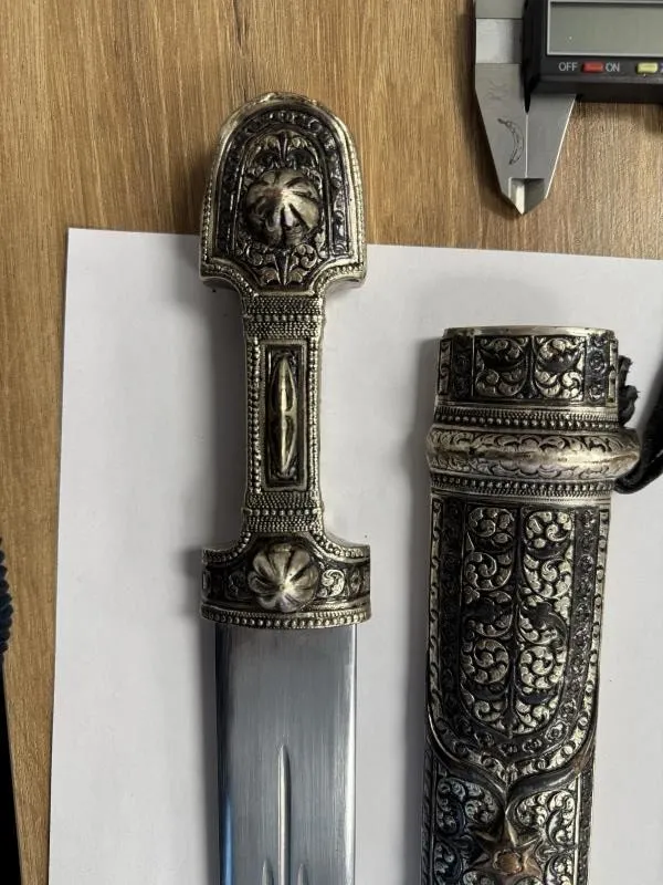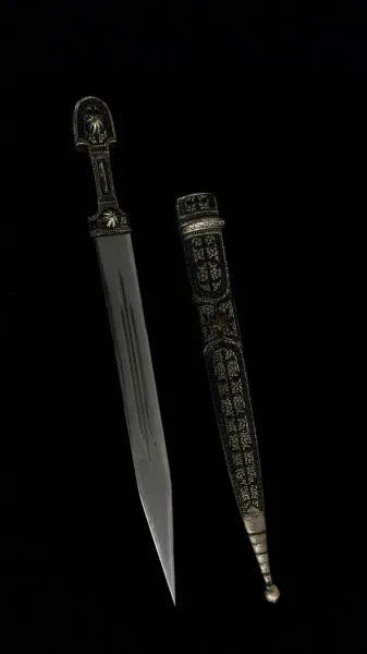 Ещё один кинжал – кавказский в ножнах, со стальным клинком и рукояткой и ножнами из серебра, ушёл с молотка за 171 369 тенге.