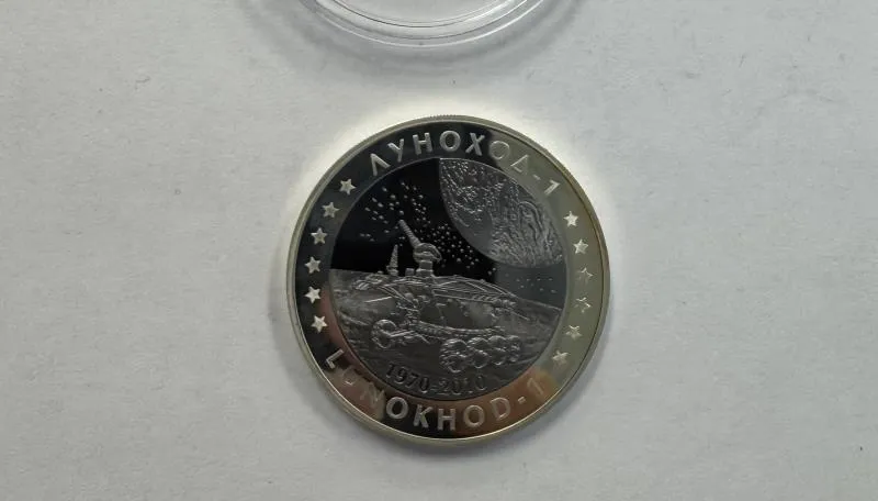 Сувенирную монету из серебра "Луноход 1 из серии Космос" номиналом 500 тенге продали выше заявленной стоимости – вместо 136 693 тенге за неё заплатили 242 160. Она выпущена в 2010 году тиражом 4 000 экземпляров.