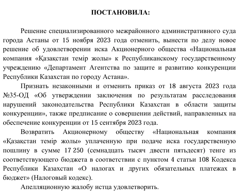 В судебной коллегии по административным делам суда Астаны решили, что агентство, расследуя деятельность КТЖ, не принял во внимание и не применил нормы законодательства, регулирующие порядок примыкания строящихся ж/д путей к путям ветвевладельцев, которым по настоящему делу является АО «СЭЗ «Хоргос-Восточные ворота». 27 марта 2024 года апелляционную жалобу КТЖ удовлетворили.