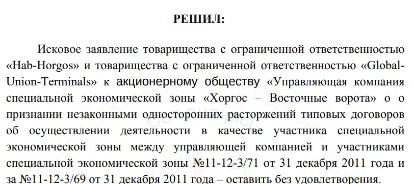 По мнению представителей Hab-Horgоs, сотрудники спецзоны намерено вытесняли предприятия из участников СЭЗ в интересах КТЖ. Оба истца должны были инвестировать крупные суммы: Hab-Horgоs – 17,2 млрд тенге, а Global-UnionTerminals – 2,6 млн долларов. В суде выяснили, что с даты заключения и расторжения договоров денег в проекты не вложили.