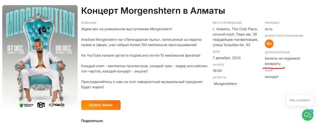 Концерты Алишера Моргенштерна должны были состояться 7 и 8 декабря в Астане и Алматы. Некоторые поклонники стали переживать, что при покупке билетов была пометка: возврату не подлежат.