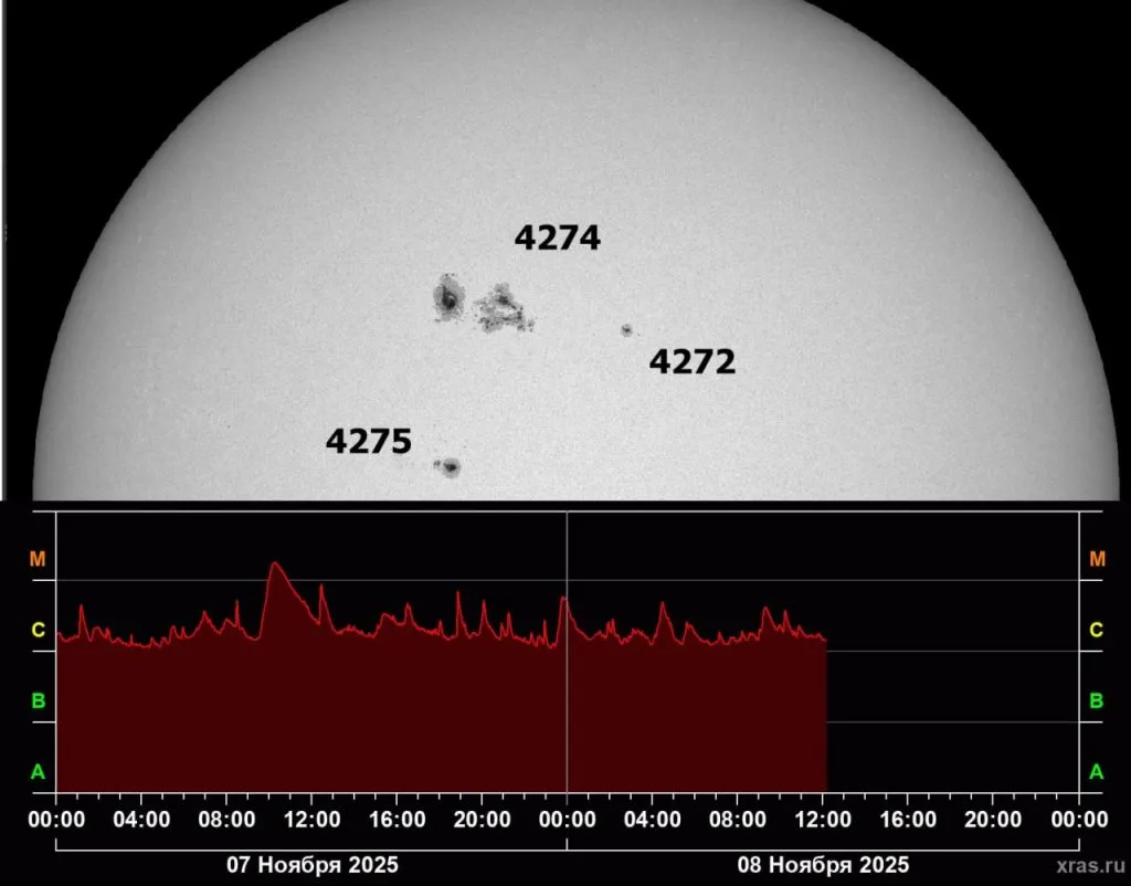 "Основные центры солнечной активности, которые всю последнюю неделю перемещались вращением Солнца с левого восточного края, где они появились в конце октября, в сторону центральных областей, достигли их и в ближайшие двух-трёх суток будут иметь возможность оказывать максимальное влияние на Землю", – рассказывали астрономы.