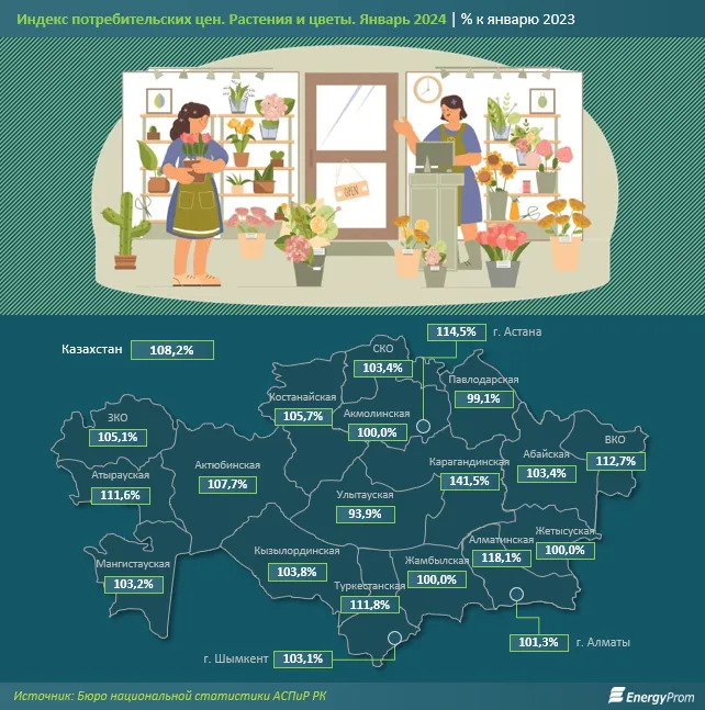 «Популярные во всём мире розы в январе продавали в среднем по 946 тенге за штуку. Дороже всего они обходились жителям Абайской области: 1,4 тыс. тенге за цветок. Чуть дешевле они стоили в Костанайской и Восточно-Казахстанской областях. Меньше всего приходится платить в Шымкенте: всего 600 тг»,