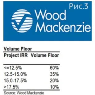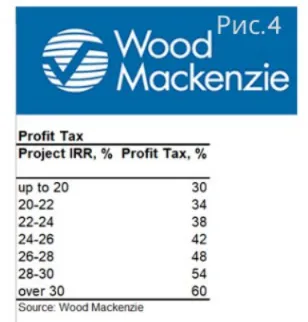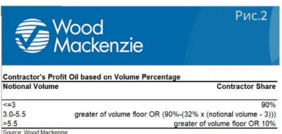 Минимальный порог раздела продукции в пользу подрядчика зависит от показателя внутренней нормы доходности. 16 лет инвестиций без перехода к добыче привели к тому, что максимальный показатель внутренней нормы доходности (ВНП/IRR – показатель оценки эффективности инвестиций) составил около 6%. WoodMackenzie оценивает его ещё меньше – в 3,5%. Но вернёмся к минимальному порогу раздела продукции. В зависимости от показателя ВНП, он меняет от 12,5% до 10%. Подробнее можно ознакомиться на скриншоте ниже.