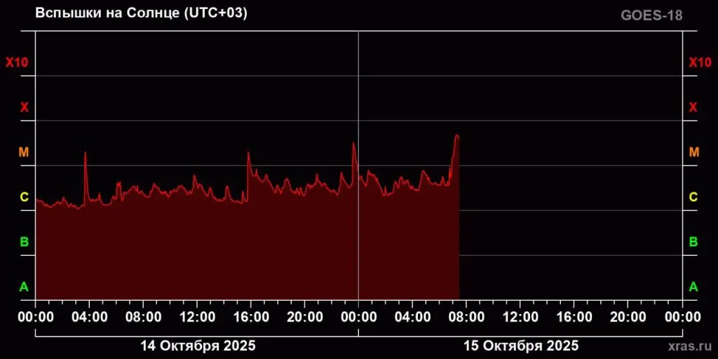 Как пояснили специалисты, сегодня, 15 октября, может быть достигнут многомесячный пик по силе таких вспышек.