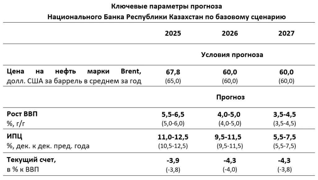 Что касается экономики в целом, Нацбанк улучшил прогноз по росту ВВП на 2025 год до 5,5–6,5%. Такой пересмотр объясняется активной инвестиционной деятельностью и высоким внутренним спросом. Прогноз на 2026 год остался без изменений — 4–5%, а к 2027 году рост должен стабилизироваться на равновесном уровне.