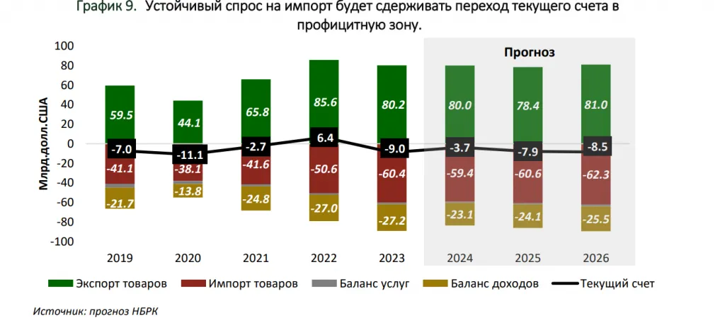 Эксперты Нацбанка также обещают продолжение роста импорта товаров. По прогнозам он должен увеличиться с 60,4 миллиарда (2023 год) до 62,3 миллиарда (2026 год). Также ожидается умеренное увеличение экспорта с 80,2 млрд (2023 году) до 81 млрд (2026 год).