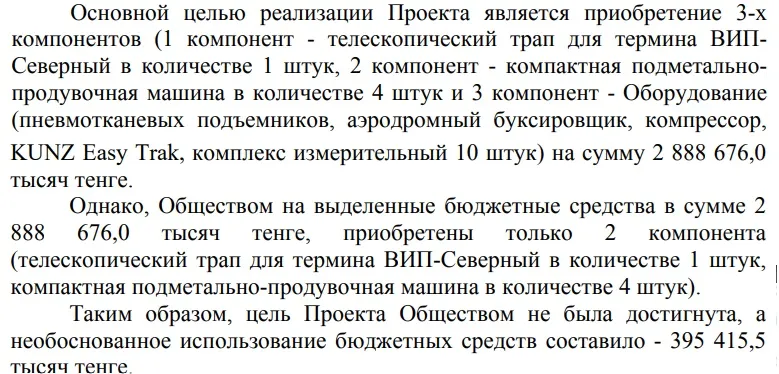 Кроме пожарной проверки, в аэропорту с 12 января по 18 апреля 2023 года провели ещё и финансовую. Приказом комитета внутреннего госудита 23 ноября 2023 года утвердили заключение с нарушениями на 429 349,7 тысяч тенге.