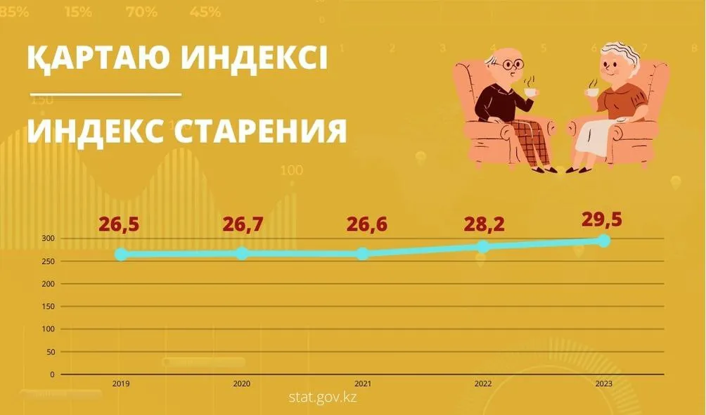 В 2023 году индекс старения населения в Казахстане составил 29,5. То есть, на 100 детей младше 15 лет приходилось 29,5 человек в возрасте более 65 лет, сообщает CMN.KZ