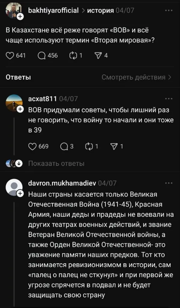 Посмотреть, как выглядит настоящая военная обстановка можно в соцсетях. Так, например, в Threads с особым жаром спорят о наименовании события и его важности. При этом, сомнению подвергают термин «Отечественная война».